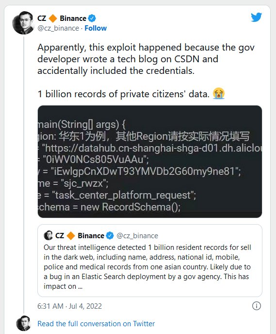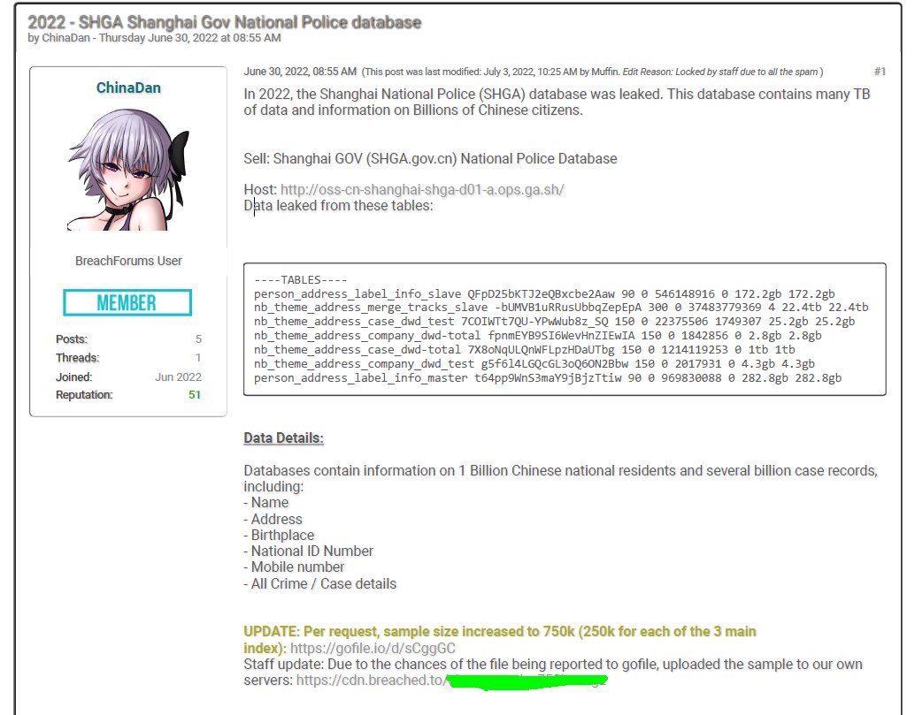 Shanghai National Police (SHGA) database of over 1 billion Chinese citizens is apparently up for sale for 10 Bitcoin (~USD $200,000 ). This represents terabytes of personal data including full name, address, birthplace, age, birth year, nationality, photo information, national ID number, mobile number, and any committed crimes and case details for the individuals. (Source link has been obscured, sorry.)