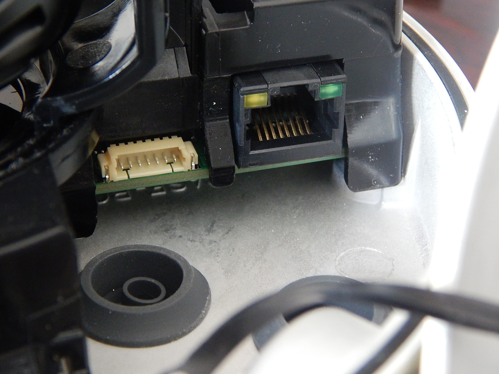 The CAT5 connection includes power and connectivity lights, but the orientation inside the case makes it such that connectors with long strain reliefs may be hard to fit inside the case. In most cases the cable will be field terminated anyway, so it’s probably not a big problem. Waterproof grommets are included to ensure a water tight seal for exterior installations. If you elect to use the additional connectors, note that they have fairly long leads on them, so be sure to include additional room in your mounting configuration. Although for most installations, a single CAT-5E cable is all that should be needed. There is some indication in the Samsung documentation that audio is available via a built-in microphone, but we could not locate a microphone anywhere on the unit, and were unable to hear any audio without the addition of a discrete microphone added to the audio input. We did not test the talk-back audio output feature. The connector to the left of the CAT5 connector is a multi-feature connector which has the audio in/out and alarm in/out harness. The alarm input/outputs were not tested.