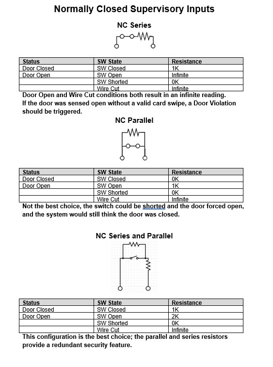 Nearly every project we work on, we recommend that alarm initiating devices, especially door contacts, are to be configured using end of line (EOL) resistors for 4-state supervisory circuits. The actual resistance value and configuration can vary by system manufacturer, but typically it involves wiring a 1K Ohm resistor in series and another in parallel with the switch, at the terminating device itself (not in the panel or junction box above the door). This ensures that we have circuit supervision from the alarm panel (or card reader panel) all the way down to the device termination, so we know if the device is in a normal state (1), an alarm state (2), shorted state (3), or cut state (4). This is known as 4-state supervision, because it distinguishes between 4 possible scenarios for the supervised device.