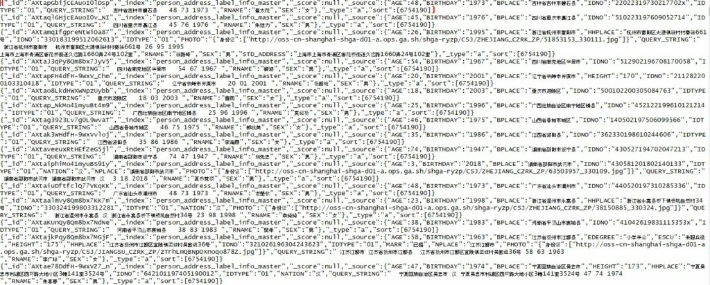 Oddly enough, there doesn’t seem to be anything called the “Shanghai National Police”, only the “Shanghai Municipal Police” returns any search results as a legitimate entity in major search engines. Still, regardless if this is a translation error or some other mis-identification, the validity of the data appears to be proven. We attempted to connect to the sample link provided through a VM and VPN and were able to download the 110mb compressed gzip sample file and view the sample files. When uncompressed, the files were several hundred megabytes each in JSON format in English language and Chinese characters (multi-byte format), consisting of personal information, police record case data files, and an address merge with cell phone data. Here’s an example of the personal detail record file: