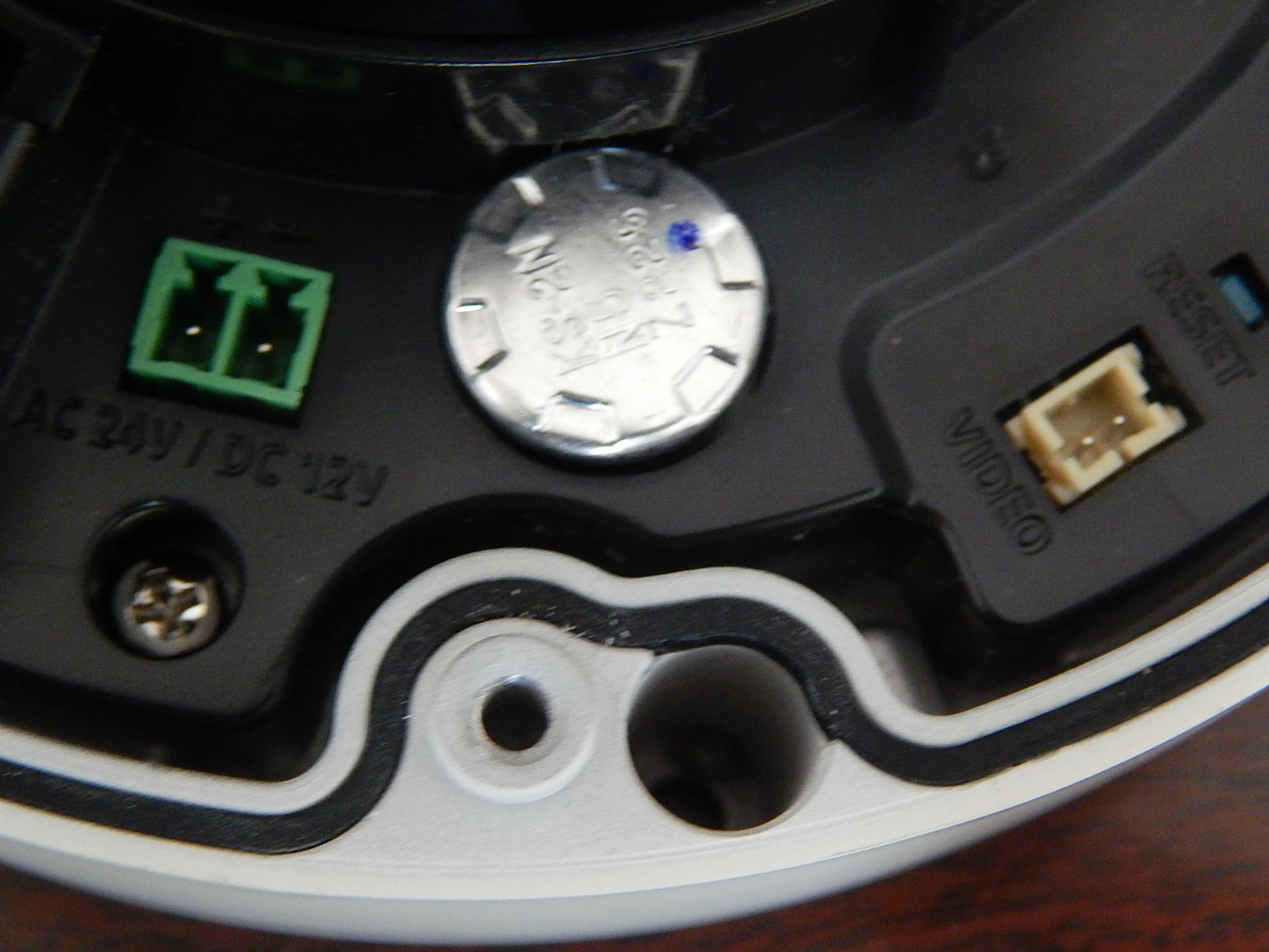 The CAT5 connection includes power and connectivity lights, but the orientation inside the case makes it such that connectors with long strain reliefs may be hard to fit inside the case. In most cases the cable will be field terminated anyway, so it’s probably not a big problem. Waterproof grommets are included to ensure a water tight seal for exterior installations. If you elect to use the additional connectors, note that they have fairly long leads on them, so be sure to include additional room in your mounting configuration. Although for most installations, a single CAT-5E cable is all that should be needed. There is some indication in the Samsung documentation that audio is available via a built-in microphone, but we could not locate a microphone anywhere on the unit, and were unable to hear any audio without the addition of a discrete microphone added to the audio input. We did not test the talk-back audio output feature. The connector to the left of the CAT5 connector is a multi-feature connector which has the audio in/out and alarm in/out harness. The alarm input/outputs were not tested.